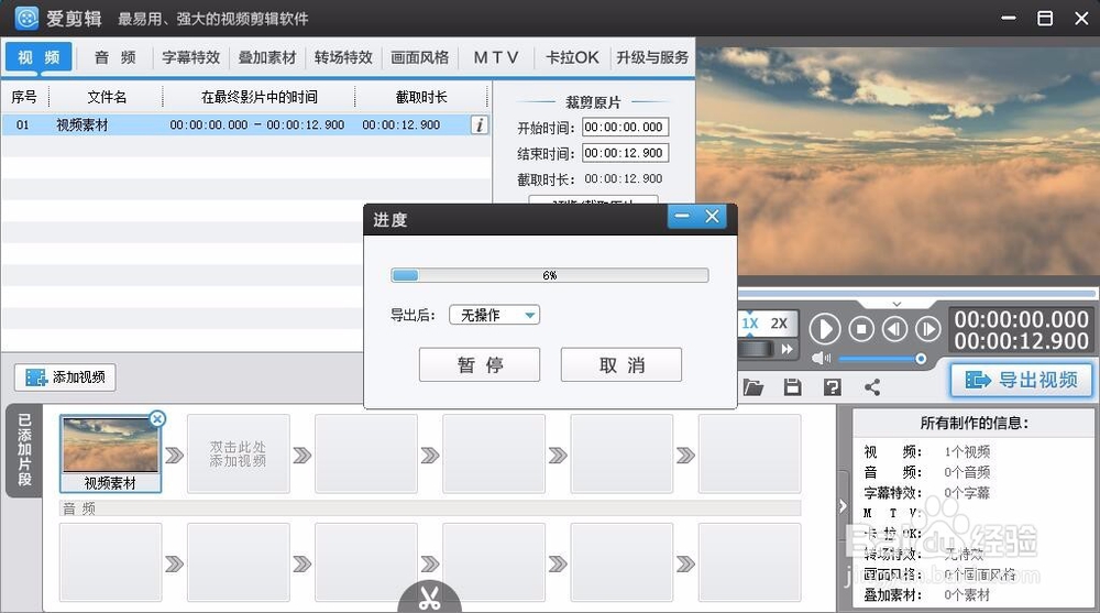 利用视频的播放开始以及暂停功能,确定爱剪辑字样的起始段:片头以及片尾部分。