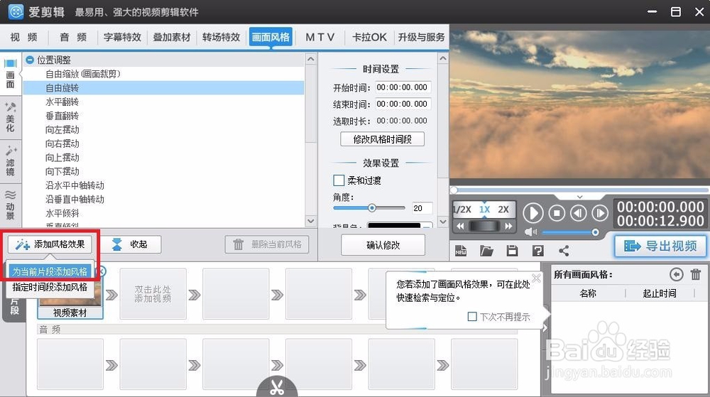 选择好想要添加的特效后,点击“添加风格效果”按钮,可以选择“为当前片段添加风格”或“指定时间段添加风格”,添加成功后,可在“效果设置”中设置角度,设置成功后,选择确认修改,如图所示