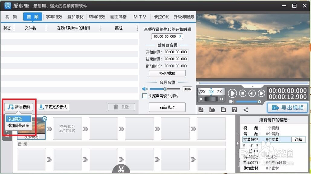 音频:进入音频界面后,点击“添加音频”可选择添加“音效”或“背景音乐”,如图所示