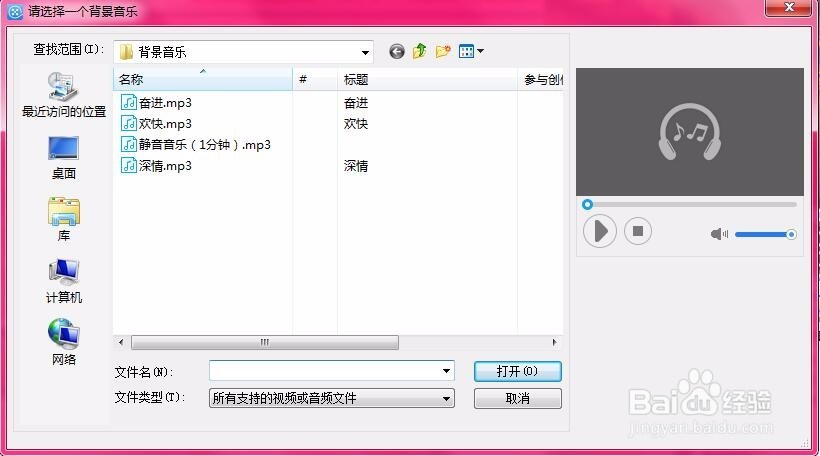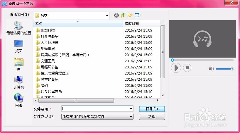 选择添加“音效”或“背景音乐”,会弹出素材窗口,根据需求选择自己需要的素材,也可下载素材添加,如图所示