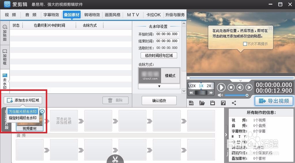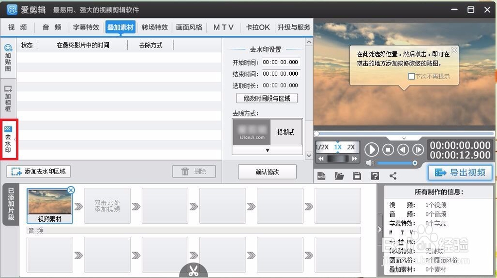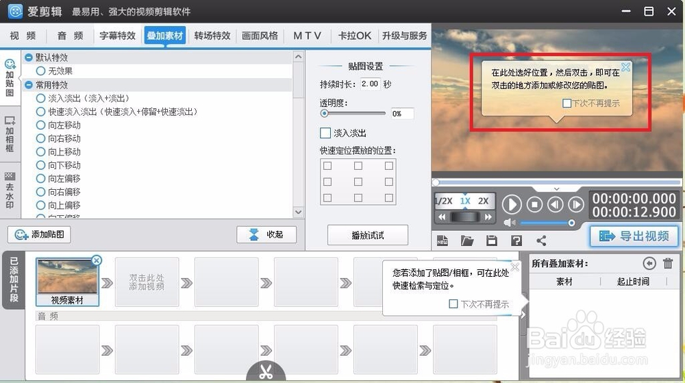 点击叠加素材→可以添加图片水印,固定的图片,自定义上传的图片等素材(可以缩放、转向、复制、剪切、粘贴等操作)→勿忘设置时间(默认只显示1秒)。