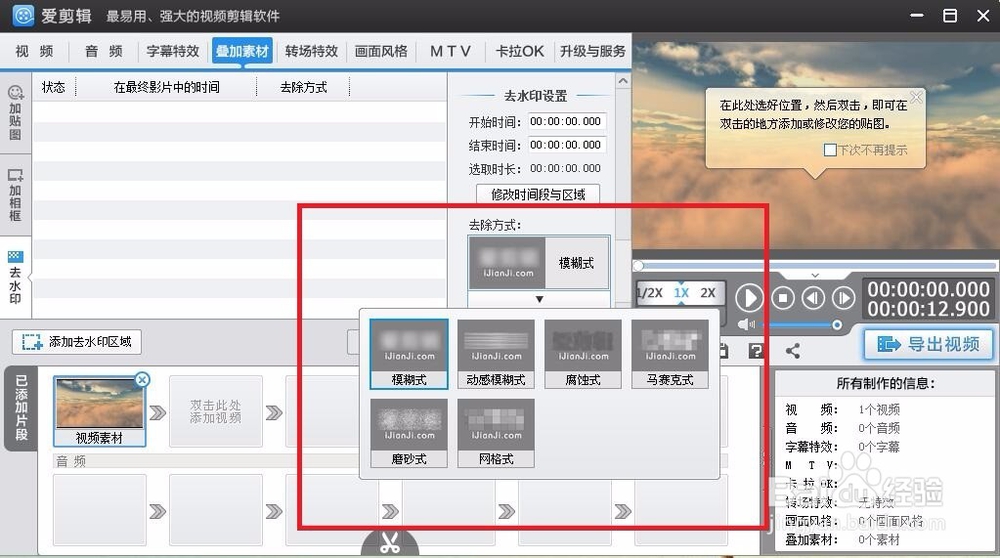 在叠加素材中,有一项“去水印”功能,此项功能可为视频添加马赛克,进入“去水印”功能页面,在页面中间“去水印设置”中选择“去除方式”,如图所示
