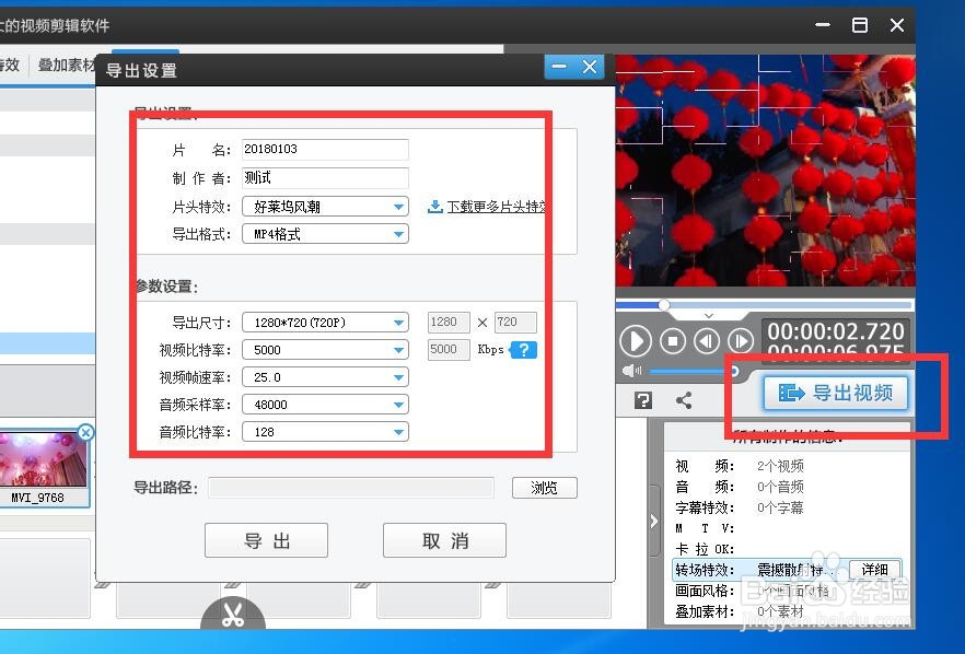 所有特效设置完毕后,选择界面右侧“导出视频”功能,可对视频基本资料及参数再次进行修改,如图所示