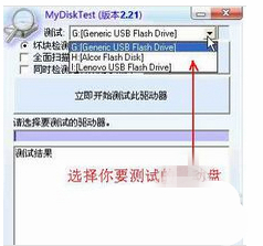 2、插入设备后,MyDiskTest会自行侦测出所有插入的可移动磁盘,选择你要检测的磁盘;