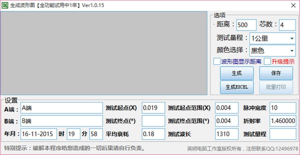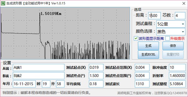 OTDR曲线图生成工具是一款专业生成光纤OTDR波形图的图片生成器。用户根据实际情况填写距离及光纤芯数、A/B端、测试起点终点、平均衰耗、测试起点终点范围、测试波长、测试里程等信息,点击生成EXCEL文件就能生成一条光纤的测试图。