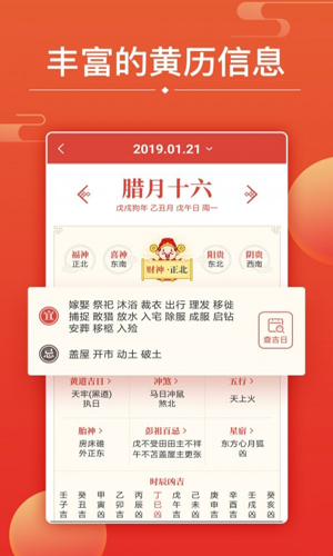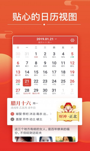 【美观实用】拥有比系统日历更丰富的黄历信息。【功能多样】随时随地查吉日,热点资讯刷不停。