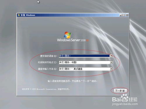 1、设置从光盘启动,开机读盘。用户界面显示选择安装语言、时间与货币格式、键盘和输入方法,如图。