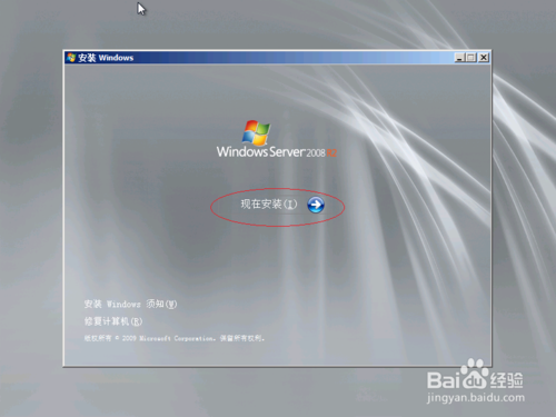 2、现在正式安装Windows Server 2008 R2 x64企业版,点击"现在安装"向右箭头。界面左下角可选择"安装Windows须知"、"修复计算机"并显示版权信息。