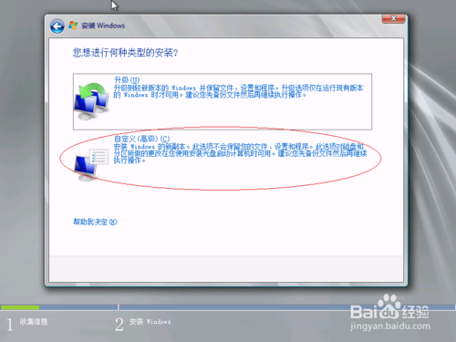 5、选择安装类型为自定义(高级),此为全新安装Windows Server 2008 R2操作系统;如果选择升级,则是从低版本升级到Windows Server 2008 R2操作系统。如图,你可根据需要而定。