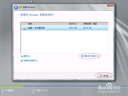 6、安装操作系统之前硬盘必须分区,如图点击驱动器选项(高级)建立磁盘分区。