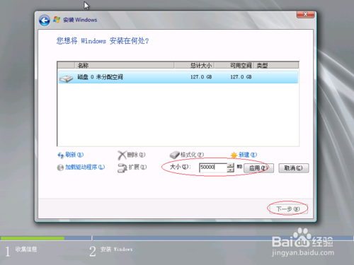 8、分配磁盘分区大小,点击应用。当然硬盘够大分区容量还可扩大,建议至少分配50G。
