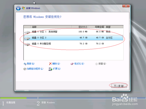 9、选择安装Windows Server 2008 R2 x64企业版的分区,一般都是选择第二个分区即C:盘,第一个分区为系统保留分区。如图,选择完毕点击下一步。