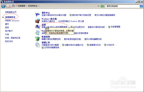 3、唤出"控制面板"程序窗口,如图所示。点击"系统和安全"图标,用于查看并更改系统和安全状态。