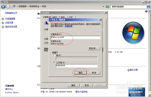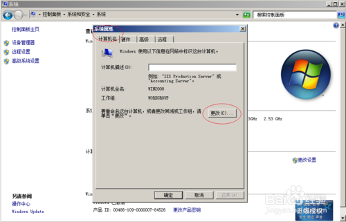 6、如图所示,弹出"系统属性"对话框。点击"计算机名→更改"按钮,"计算机名/域更改→计算机名"文本框输入新计算机名。