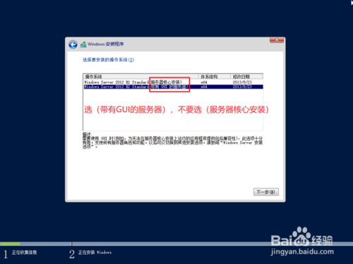 3、选择下面(带有GUI的服务器)。不要选上面的(服务器核心安装),否则安装后就出现c:\windows\system32\cmd.exe