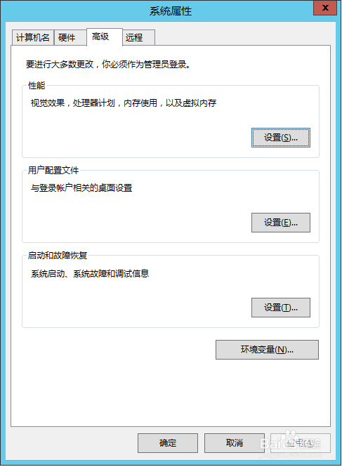 5、切换到“高级”标签,单击“环境变量”打开环境变量对话框。