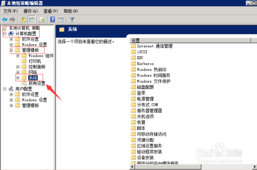 2、在打开的本地组策略编辑器,依次点击“计算机配置”---“管理模板”---“系统”如图所示