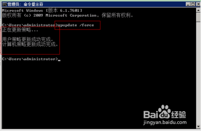 5、设置完毕,使本地策略生效,命令行输入: gpupdate /force