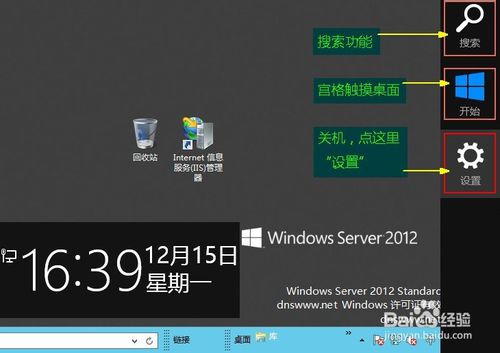 2、桌面会同时出现两个灰色方块,左边是本服务器当前时间,右边竖条的分别是“搜索功能”“宫格触摸界面”“设置”,我们要操作关机,所以单击“设置”;