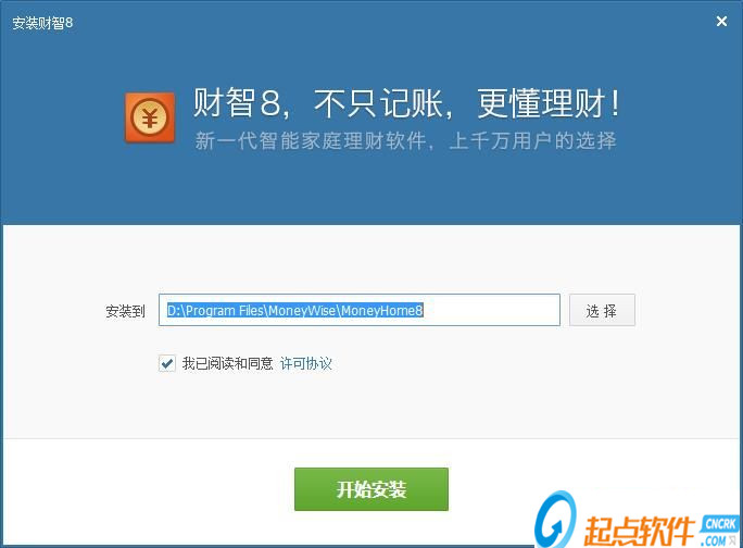 首先在起点软件园下载该软件的安装包,双击安装包我们进入到财智8的安装向导。财智8的安装向导非常简洁,安装向导为我们默认同意了许可协议,点击[开始安装]就可以将财智8安装在电脑上了;