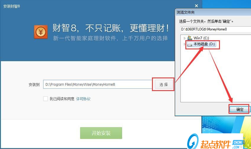 需要修改安装路径的朋友们,点击安装路径框旁边的[选择],在弹窗中选择好想要安装财智8的文件目录,点击[确定]就可以更改安装路径了;