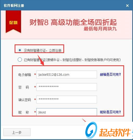 在注册页面中选择[没有财智通行证,立即注册],按照提醒填写好注册信息之后,点击[开始使用]就可以完成注册了;