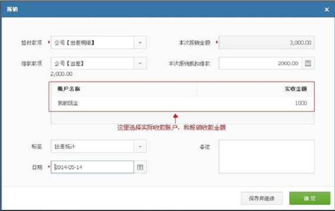 1、从公司预借 2000 元用于出差,在出差途中总共花费了 3000 元,回到公司进行报销和还款。以下是在软件里的处理方法: