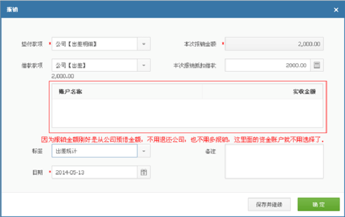 2、比如借款 2000 元用于出差,而实际出差时刚好消费 2000 元,那么直接抵消借入款 2000 元即可。如图 :