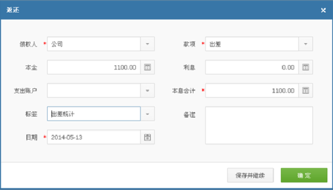 最后: 记录报销和还款的费用详情。使用【债权】 -- 【报销】。选择垫付款项和所需报销的明细;并选择借款款项,用于报销抵扣借款 2000 元;