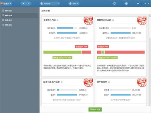 家庭财务投资是资产负债的各种组合和配置,财务诊断能够在大量的数据中进行分析和判断,帮助用户了解家庭财务健康状况,发现可能存在的健康隐患,为投资决策提供重要的参考指标。资产负债率,投资与净资产比率,紧急备用金指数,贷款压力比率,储蓄性支出比率...