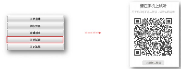3.在直播助手中,先点击左侧按钮【开始试音】,用手机扫描二维码进行试听