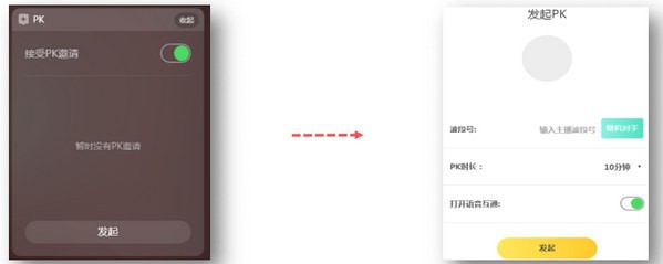 5.直播助手右侧可选择开启PK功能,接受别人的PK邀请或点击【収起】,収起一场PK,选择指定/随机对手、时长、语音是否互通等