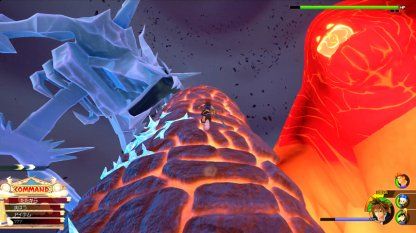 必须登上画面中央的岩石塔才能攻击泰坦族,先边闪避攻击边快速登上岩石塔吧。登上塔后,就可以像普通BOSS战时一样,使用普通攻击和魔法来战斗了。