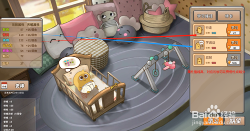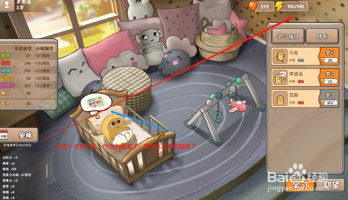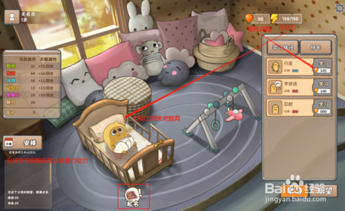 2、宝宝下面可以起名字,右上角有悟性点数和行动力。