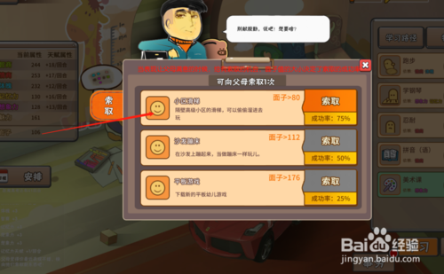 6、父母对你达到一定的满意度,会给你索要的机会,可以选择你想要的,不过有几率是不成功的。