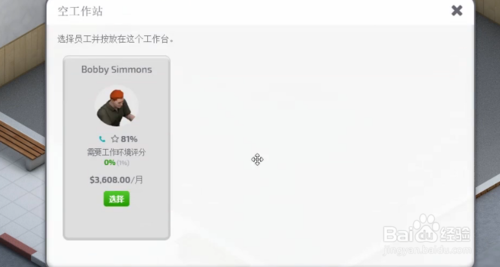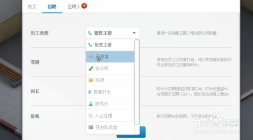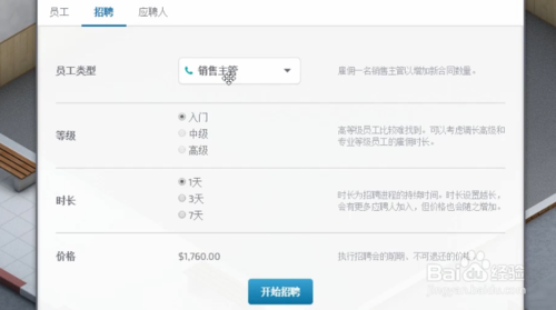 然后我们需要找一个销售经理,因为一开始我们不仅没有钱,而且还不能主动赚钱,需要接收订单才能赚钱。我们点击【员工---招聘】可以招聘销售主管,一段时间之后会有几个应聘者,从中选择一个雇佣,要是有工资低效率又高的主管就直接雇了吧。