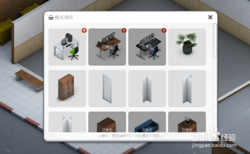 之后我们需要购买一张办公桌,有了办公桌员工才能正常的工作,点击【购买项目】然后选择第一张办公桌就可以了。
