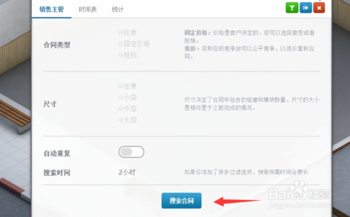 然后我们点击办公桌,选择刚才雇佣的销售主管,让他开始工作。销售主管来到办公桌之后我们点击【搜索合同】,这样我们就可以准备开始赚钱了。