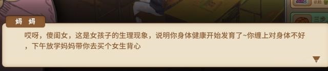 至于为什么会说男生会不会尴尬?那是因为,游戏里有很多都是女生特有的生理变化。比如女生开始发育了,或者第一次来“大姨妈”了,都会在游戏的一个环节提出来了。那么,作为男生的你,碰到这个情节,会不会尴尬呢?当然,游戏里这个时候出现的都是妈妈这个角色。如果是爸爸这个角色出现,那就太违和了。毕竟这是正经游戏,而不是“鬼父”情节的游戏。