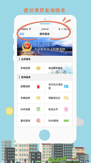 1、江西公安app上可以进行身份证办理进度查询、驾驶证计分情况、案件查询、自动挪车服务;2、通过江西公安app可以进行户口办理,身份证丢失,出入境办理;