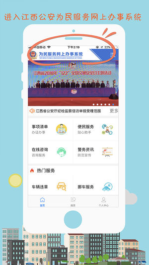 江西公安app是江西省公安厅开发的“互联网+公安”的政务服务平台的手机客户端,江西公安app为群众提供更加便捷的公安业务服务。江西公安app包括行政审批、办理证照、便民服务、警务资讯四大功能类型,群众可以查看办事指南、预约、申报办理各项业务,查询办件进度、重名、驾驶证、机动车违法等信息。同时江西公安app还开展了堵路移车、在线咨询等功能。