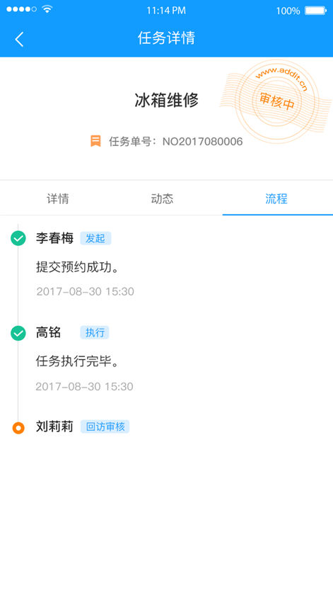 6)高端功能:抢单、回访、配件、签到、签退、导航、挖单提醒、产品明细、多级选项、语音记录、费用明细、手写签名、结算单、单据打印等。