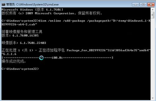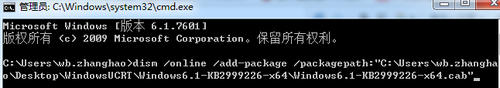 ——输入:dism /online /add-package /packagepath:"X:路径文件名.cab"