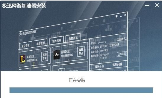 正在安装极迅网游加速器,安装程序正在将极迅网游加速器的文件安装到指定文件夹中。可能需要几分钟的时间;