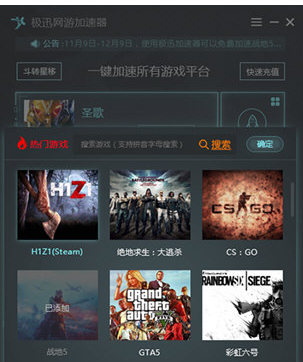 极迅网游加速器是一款专门针对网络游戏的网游加速器。该加速器支持大多数国内、国外热门游戏,提供网络生活新体验,能有效解决玩家在网游中遇到的延时过高、登录困难、容易掉线等问题。使用这款加速器能够能有效解决玩家延迟过高,游戏登陆困难等问题,拥有路由动态智能优化系统,更提高了高峰期的稳定性。 其中绝地求生大逃杀,彩虹6号,战地1,圣歌,怪物猎人世界,全境封锁2,激战花园,GTA5,荒野大镖客,CS:GO,COD15,堡垒之夜,猎杀对决,无人深空,NBA2K19等诸多国内外热门主流游戏的玩家反响最为积极,并推荐使用。