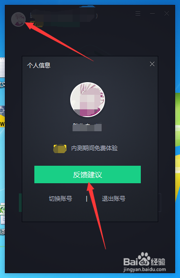 登录成功之后,点击图示位置软件左上角“头像”,然后点击图中的“问题反馈”。
