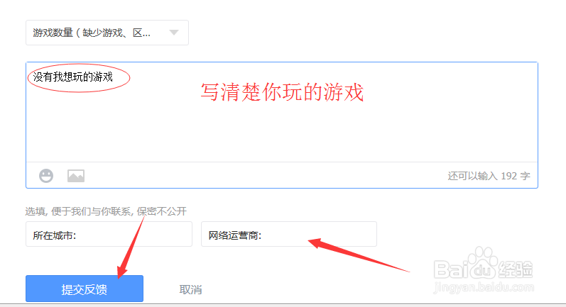 然后在问题详情中输入你的问题,你想要玩的游戏,包括区等,然后点击下方的“提交反馈”