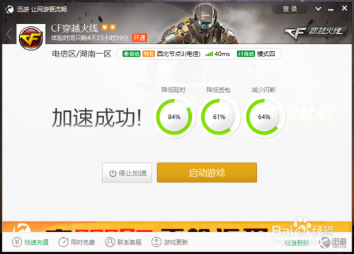 第五步,关闭文件夹,在迅游界面关闭登录界面,记住千万不能登陆,然后点击启动加速,等到绿条到99%的时候,显示你已获得5天的免费体验时间,点击立即免费体验。