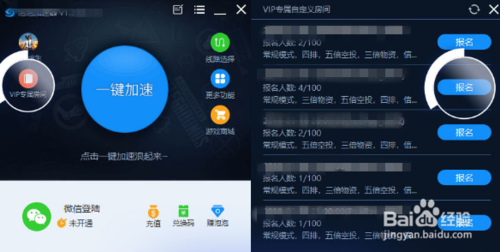 在加速器客户端界面先用微信登陆,点击“VIP专属房间”并点击“报名”