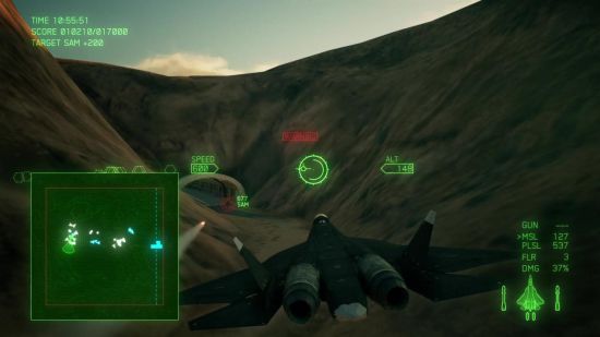 本关的冠名机出现条件为维持低高度突破敌军雷达网。具体的高度限制尚不明确,笔者是以47米的高度达成的。维持高度的方法很简单,降低到目标高度之后按住L1+R1保持水平姿态,之后只使用L1和R1进行平移改变航向即可,不需要用左摇杆进行上下方向的俯仰和水平方向的翻滚,很容易改变高度。